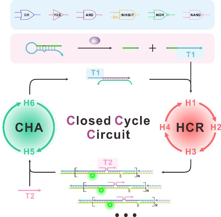 该工作中,陈金阳团队提出了一种基于杂交链式反应(HCR)和催化发夹组装(CHA)协同双向激活的全闭环运转DNA机器,并将其应用于高灵敏逻辑运算和分子识别。该DNA机器在信号放大方面具有无需蛋白酶、无副产物,以及可实现高阶指数扩增等优点。通过对输入元素和计算单元的系统设计,该DNA机器能够准确执行经典逻辑门操作,完成“弱输入-强输出”的逻辑运算。此外,以DNA机器为信号扩增核心,集成DNA修复酶(APE1)靶标识别模块,成功建立了一种高灵敏的APE1均相检测新方法,有望为相关肿瘤疾病的早期诊断和预警研究提供新的研究思路和启发。