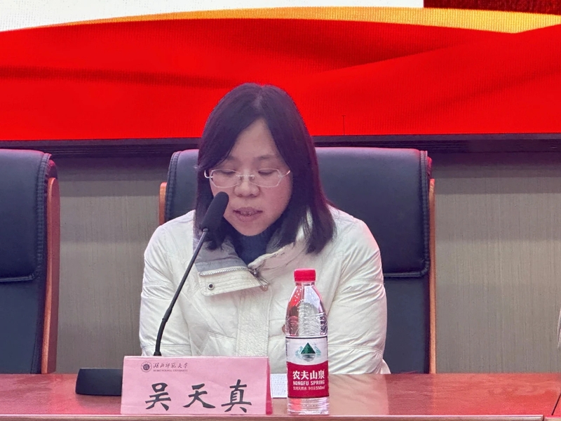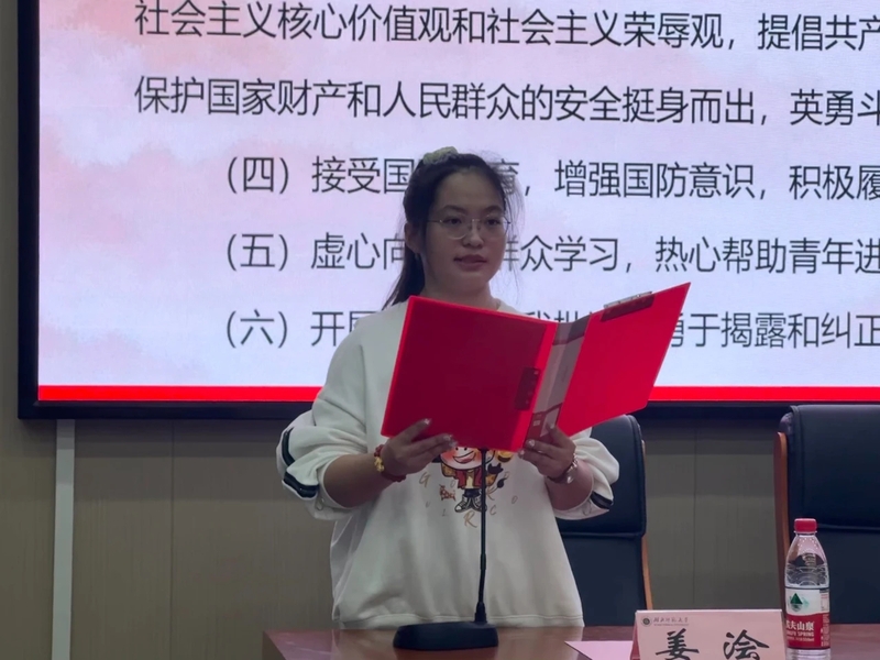 最后,吴天真对刚刚加入中国共产主义青年团的同学们表示祝贺,同时提醒同学们“团员”这一身份代表的是更多的责任和担当,并向新入团的同学提出三点期望,一是要理想远大,道德高尚;二是守纪正直,做有良好品质的学生青年;三是坚持发奋学习,争做学习楷模,起好模范带头作用。不断提高政治站位,深化思想认识,增强自觉行动,在言行上做好表率,学习榜样,争做榜样,在团徽指引下奋勇前进,用实际行动为团旗增光添彩。