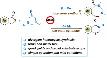 由于含硫杂环化合物在生物活性天然产物、药物分子和功能材料中的重要应用,含硫杂环的构建在合成化学领域受到了广泛关注。相比于构建五元和六元硫杂环化合物,含硫中环化合物的合成由于存在着不利的熵效应和跨环张力,构建含硫中环化合物更具有挑战性。因此,开发简单绿色的合成路线实现含硫中环化合物的高效构筑一直是有机合成化学的研究目标之一。基于此,威廉williamhill周耀博士研究团队报道了无金属条件下取代基控制的苯并二磺酚酮与六氢-1,3,5-三嗪化合物发散环化反应,利用六氢-1,3,5-三嗪化合物作为四元/二元合成子,在温和的条件下,合成一系列八元环化合物和六元环化合物。