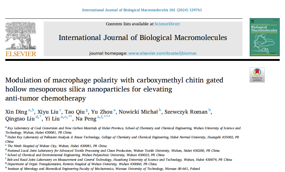 日前,国际知名期刊International Journal of Biological Macromolecules(《国际生物大分子》)发表了我院丁鑫博士在生物化学领域的最新研究成果。论文题为“Modulation of macrophage polarity with carboxymethyl chitin gated hollow mesoporous silica nanoparticles for elevating anti-tumor chemotherapy”(羧甲基甲壳素门控的中空介孔二氧化硅纳米颗粒调节巨噬细胞极化提高抗肿瘤化疗)。丁鑫博士为论文第一作者,武汉科技大学刘义教授和彭娜教授为共同通讯作者,武汉科技大学、威廉williamhill分别为论文第一、第二通讯单位。International Journal of Biological Macromolecules是一本公认的研究所有天然大分子的化学和生物方面的国际杂志,中科院SCI化学大类一区,最新影响因子为8.2。
