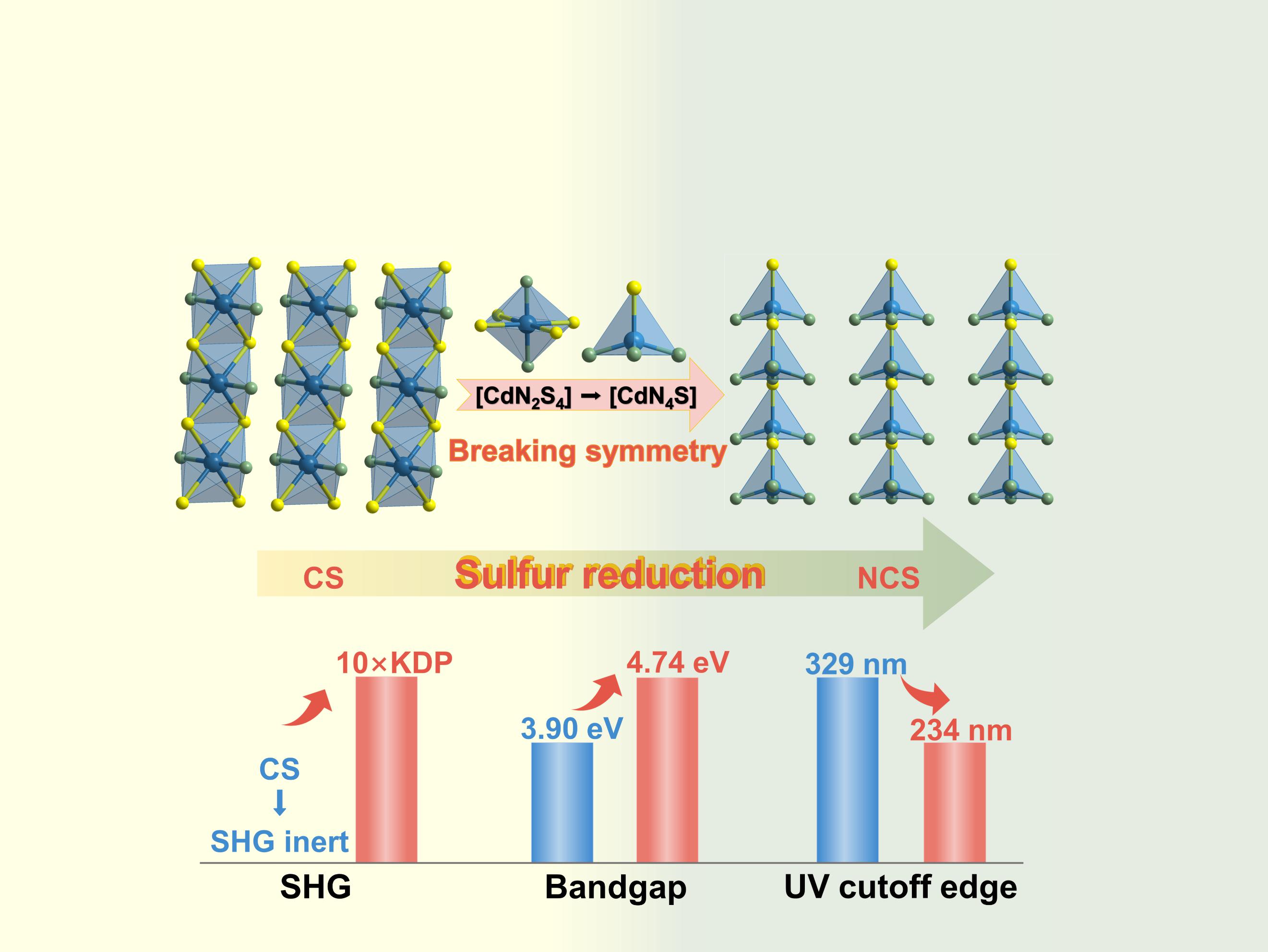 紫外非线性光学(NLO)晶体在激光科学技术中占有重要地位。它们能够通过二次谐波(SHG)效应将激光的固有波长调谐到紫外甚至深紫外区域,主要应用于短波通信、激光雕刻、高密度存储、医疗诊断和精密仪器加工等领域。理想的紫外NLO晶体需要同时满足“短紫外截止边”、“大倍频系数”及“适中双折射率”三个核心指标,然而,它们之间往往相互影响和制约,使得开发最佳综合性能的紫外NLO晶体极具挑战性。