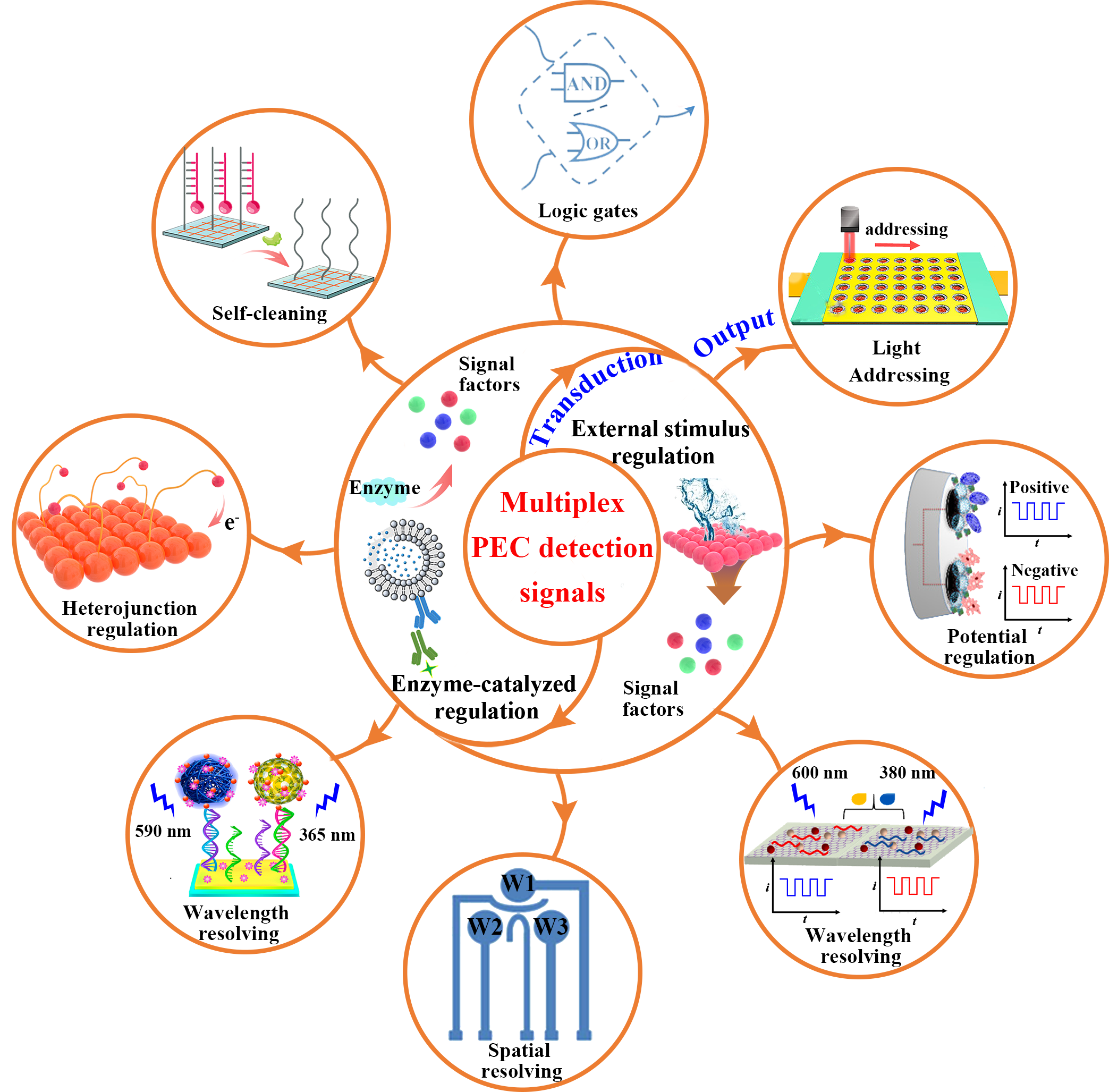 如何完成光电化学(PEC)传感器单识别界面上多重检测信号的转导与输出是 PEC 传感技术应用于环境介质中多目标物高通量检测的瓶颈问题。近年来,为解决PEC传感器多元检测的应用壁垒,广大分析化学研究者先后开发出诸如酶调控型、光寻址型、电位调控型、波长分辨型、刺激调控型等多种可用于多目标物同时检测的PEC传感器。这些类型PEC传感器的开发极大地丰富了传感器表面信号转导与输出机制,但每种类型的传感器也有其固有的发展限制。系统性总结现阶段PEC传感器表面信号转导输出机制,有利于推动PEC多元检测技术的后续发展。最近,李新副教授结合自身所取得的研究成果,系统总结了PEC传感器单识别界面多重检测信号的转导与输出策略,对比分析了每种信号调控输出策略的技术优势与应用弊端,并对单识别界面PEC传感器多重检测信号的转导与输出策略的发展方向进行了研究展望,有望推动PEC多元检测技术的发展应用。