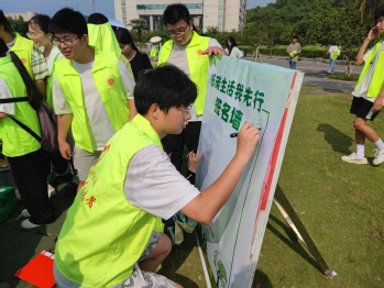 随后,参会的同学在低碳生活我先行”的主题宣传墙签名,表明了湖师青年心怀环保、行为环保,共同营造美丽的环境、共创绿色生态校园的决心活动最后,大家一同对篮球场及周边环境进行了打扫。