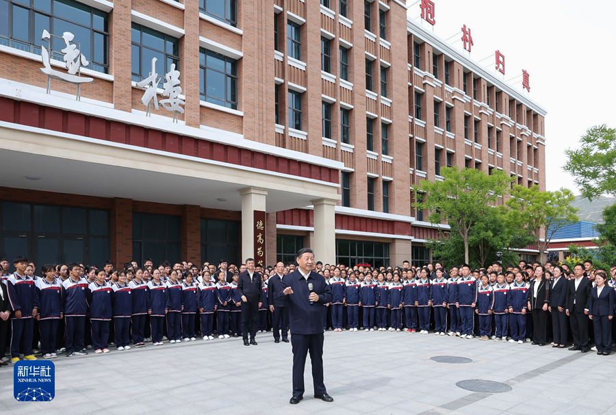 教学楼前广场上,师生们纷纷围拢过来,高声向总书记问好。习近平亲切地对大家说,我到西宁第一站就来看望老师和同学们。上海援建的这所中学,培养来自果洛牧区的各民族孩子,成效明显,意义深远。希望孩子们倍加珍惜这里的良好条件,心怀感恩、好好学习,德智体美劳全面发展,立志成为中国特色社会主义事业的接班人和建设者,努力为自己赢得人生出彩的机会。他祝孩子们学有所成、健康成长。