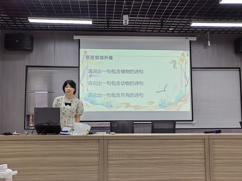 活动开始前,志愿者为同学们精选了数十首经典诗词,以小学课标古诗为主,课外拓展诗词为辅,涵盖了各个朝代,各种类型,各位诗人脍炙人口的名篇,精心制成了PPT。比赛为抢答形式,题型分为选择、填空、“飞花令”等,比赛难度难度逐层递增。此外,志愿者也准备了许多零食作为奖品,鼓励同学们积极参与,踊跃抢答。