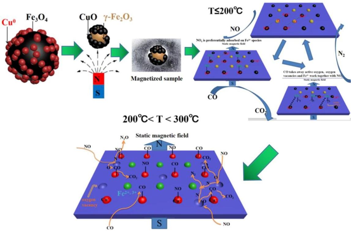 氮氧化物(NOx)的排放严重威胁着环境和人类健康。催化降解被认为是解决这一问题的有效途径。尽管贵金属催化剂表现出优异的催化活性,但其高成本、稀缺性和稳定性问题限制了其大规模应用。过渡金属氧化物因其丰富的资源和较低的成本而受到广泛关注,但合成工艺复杂且成本较高。铜氧化物因其储量丰富、成本低廉等优势,被认为是一种极具潜力的DeNOx催化剂。然而,铜氧化物在实际应用中易失活。将铜氧化物负载于合适的载体上可以有效提高其催化性能。铁氧化物因其储量丰富、成本低廉且环境友好等特点而备受关注,但纯相铁氧化物在低温下的催化活性较低。本研究通过共氧化法制备了γ-Fe2O3-CuO复合氧化物,实现了铜和铁物种之间的协同作用,即在不同温度下,铜和铁物种分别发挥主导作用,且二者之间存在相互促进、相互抑制的协同效应。更重要的是,将磁场引入到铜铁复合氧化物催化体系中,发现磁场可以显著增强催化剂的低温活性。机理研究表明,磁场促进了氧气和NO分子在催化剂表面的吸附和活化,从而提高了DeNOx效率。本研究为开发高效、稳定的NOx催化剂提供了新的思路。通过铜铁复合氧化物与磁场的协同作用,成功克服了传统催化剂的不足,为解决氮氧化物污染问题提供了新的途径。