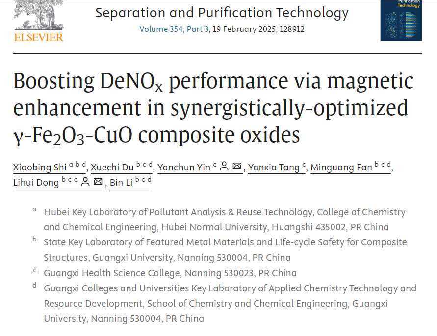 近日,我院石小兵博士与广西大学董丽辉教授、李斌教授以及广西卫生职业技术学院尹艳春教授等合作,在国际期刊Separation and Purification Technology(《分离纯化技术》)上在线发表了有关DeNOx最新研究成果。论文题为“Boosting DeNOx performance via magnetic enhancement insynergistically-optimized γ-Fe2O3-CuO composite oxides”(磁场增强 γ-Fe2O3-CuO 协同复合氧化物的脱硝性能)。我院石小兵博士为论文第一作者,广西大学董丽辉教授、广西卫生职业技术学院尹艳春教授为论文共同通讯作者,威廉williamhill为论文第一单位。Separation and Purification Technology由Elsevier(爱思唯尔)出版社创办,是一本致力于传播分离研究成果和发现的刊物、SCI中科院大类一区期刊,最新影响因子为8.1。