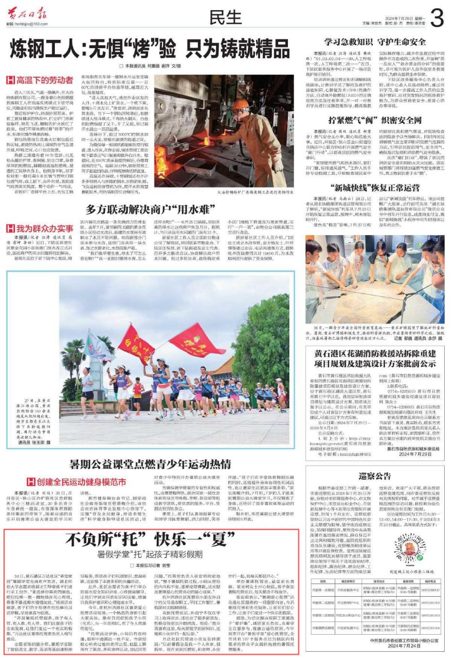 7月29日,《黄石日报》第三版报道了我院化爱前行实践队的暑期托管班工作。该实践队由我院22级和23级部分学生组成,前往黄石港区万达社区和黄印村社区开展为期3周的暑期学堂托管班活动。实践队围绕学业辅导、科普宣传、心理健康教育等主题开展社会实践活动。