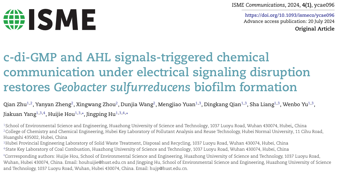 近日,国际知名期刊ISME Communications(《国际微生物生态学通讯》)发表了我院朱倩博士在电活性生物膜领域的最新研究成果。论文题为“c-di-GMP and AHL signals-triggered chemical communication under electrical signaling disruption restores Geobacter sulfurreducens biofilm formation”(电信号通讯阻滞下c-di-GMP 和 AHL信号触发的化学通讯修复Geobacter sulfurreducens生物膜的形成)。朱倩博士为论文第一作者,华中科技大学侯慧杰教授和胡敬平教授为共同通讯作者,华中科技大学、威廉williamhill分别为论文第一、第二通讯单位。ISME Communications是Nature旗下期刊,由国际微生物生态学会主办,是生态学和微生物学研究领域的顶级期刊,最新影响因子为5.1。