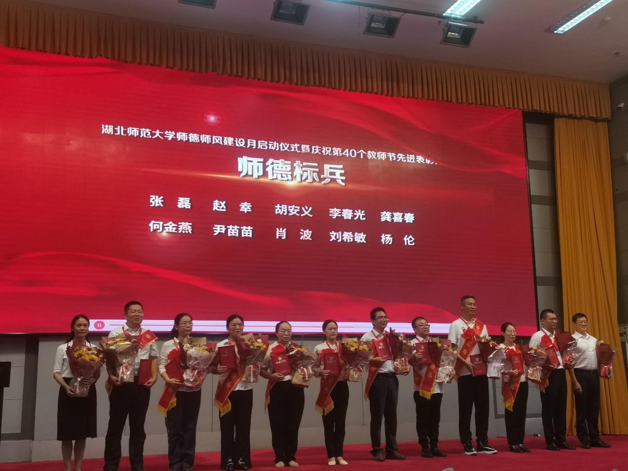 根据《关于表彰2024年度校“优秀教师”“师德标兵”和“管理服务先进个人”的决定》(湖师教〔2024〕15号),物理化学教研室尹苗苗博士荣获学校2024年度“师德标兵”。9月5日,在学校召开的2024年师德师风建设月启动仪式暨庆祝第40个教师节先进表彰大会上,尹苗苗博士连同其他获奖者受到隆重表彰。