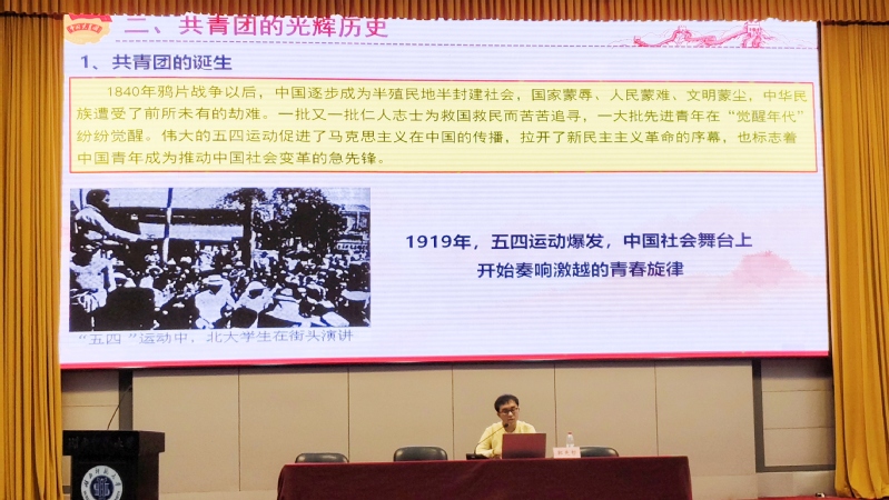 开班仪式结束后,辅导员郭先哲以《共青团的光辉历史与新时代的使命担当》为题,为全体团校学员上了第一课。他首先介绍了共青团的共青团的性质、指导思想、在新时代的基本任务,学院团委的工作重点围绕思想能力、学风助推、实践育人、创新创业、志愿服务和文化育人六大方面。随后分新民主主义革命时期、社会主义革命和建设时期、改革开放和社会主义现代化建设新时期以及中国特色社会主义新时代四个阶段介绍了共青团的光辉历史。在课上,郭先哲重点介绍了团与党之间的紧密联系,指出“党旗所指就是团旗所向”这一政治方向,强调共青团必须毫不动摇坚持党的领导、必须牢牢抓住三个根本性问题、必须坚定不移深化改革。这不仅是新时代对共青团的要求,更是对广大青年的政治引导要求。随后,他进一步介绍了新时代的共青团员要做到的“五个模范”,并指出时代在不断进步,广大青年更应该从自身出发,以身作则,新时代共青团员和广大青年生逢其时、重任在肩,要自觉对标对表“五个模范”的标准和要求,努力成为可堪大用、能担重任的栋梁之才,这不仅是对共青团员的模范要求,也是对广大青年学子的风貌要求。