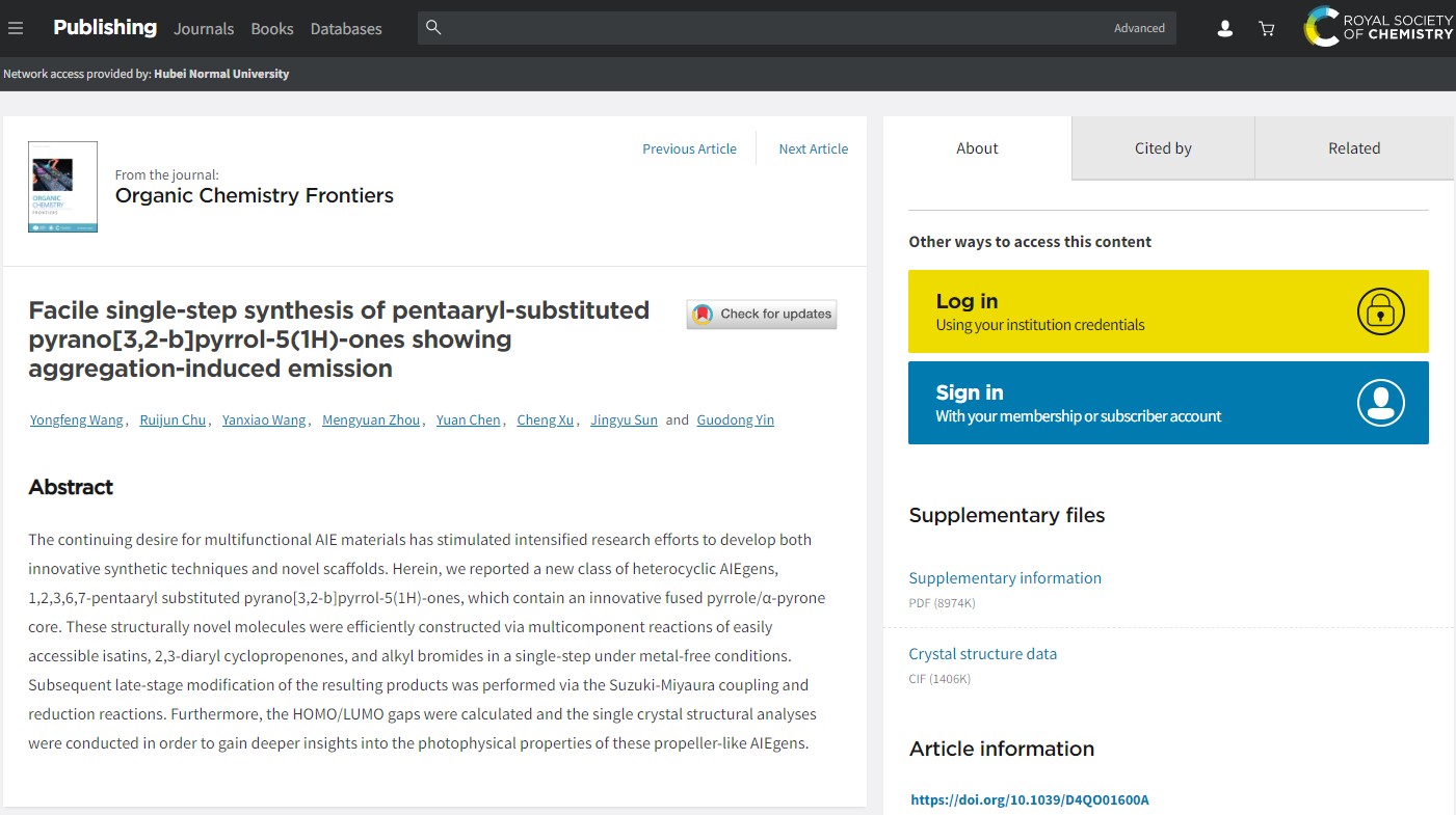 近日,国际知名期刊Organic Chemistry Frontiers(《有机化学前沿》)在线发表了我院殷国栋教授团队在新型有机功能分子合成领域的最新研究成果。论文题为Facile single-step synthesis of pentaaryl-substituted pyrano[3,2-b]pyrrol-5(1H)-ones showing aggregation-induced emission(简便单步合成具有聚集诱导发光效应的五芳基取代吡喃并[3,2-b]吡咯-5(1H)-酮)。2021级硕士研究生王永凤为论文第一作者,徐程博士和殷国栋教授为论文通讯作者,威廉williamhill为论文唯一通讯单位。Organic Chemistry Frontiers是Royal Society of Chemistry(英国皇家化学会)与中国化学会、中国科学院上海有机化学研究所合作出版,专注于CHEMISTRY, ORGANIC领域的学术期刊、SCI中科院大类一区期刊,最新影响因子为4.6。