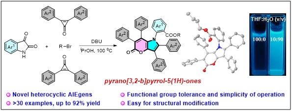 聚集诱导发光(AIE)效应的发现为有机发光材料的研究带来了新的机遇,推动着有机化学研究者们不断革新合成技术来开发具有全新结构的AIE分子。该研究工作合成了具有吡喃酮/吡咯稠合核心单元的螺旋桨状的新型AIE杂环分子,并探讨了其聚集诱导发光的机制。作者以靛红、二芳基环丙烯酮和卤代烷烃为底物,通过单步反应合成了系列多芳基取代吡喃并[3,2-b]吡咯-5(1H)-酮,并通过Suzuki-Miyaura偶联、还原和脱羧反应对产物结构进行修饰,得到了其功能化衍生物。机理研究表明,反应过程中两分子环丙烯酮分别发生C-C键断裂开环并参与分子重构。进一步性能测试表明,该类化合物展现出典型的AIE效应,在聚集态下荧光显著增强并展现出丁达尔效应。通过DFT计算模拟以及化合物的晶体结构堆积分析,揭示该类化合物是由于在聚集态下分子内运动受限从而表现出AIE效应。