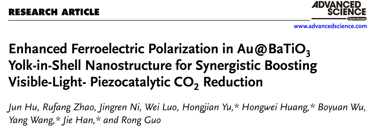 近日,我院赵茹芳博士与扬州大学胡俊博士合作,在国际知名期刊Advanced Science(《前沿科学》)上发表新型壳中核纳米催化剂Au@BaTiO3在压电光催化CO2转化还原中的最新研究成果。论文题为“Enhanced Ferroelectric Polarization in Au@BaTiO3 Yolk-in-Shell Nanostructure for Synergistic Boosting Visible-Light-Piezocatalytic CO2 Reduction”(新型Au@BaTiO3壳中核纳米结构中增强的铁电极化用于协同增强可见光-压电光催化CO2还原)。扬州大学胡俊博士为论文第一作者,我院赵茹芳博士为共同第一作者,扬州大学于洪鉴博士、汪洋教授、韩杰教授以及中国地质大学(北京)黄洪伟教授为共同通讯作者,威廉williamhill为论文第二通讯单位。赵茹芳博士负责机理解释和理论计算部分。Advanced Science是Wiley出版社旗下综合性期刊、SCI中科院大类一区期刊,最新影响因子为14.4。