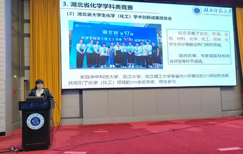 王娟对化学学科类竞赛进行了介绍,她指出,大学生学科竞赛是指高等教育阶段的普通高等学校组织的各类学科竞赛,区别于基础教育阶段的学科竞赛,参加学科竞赛可以提升技能和实际操作能力、培养团队精神和沟通能力、提升综合素质和竞争力、助力升学与就业。并对全国大学生化工设计竞赛、全国大学生化学实验创新设计大赛等国家级赛事和湖北省普通高等学校大学生化学实验技能竞赛、湖北省大学生化学(化工)学术创新成果报告会等省级赛事的参赛要求、参赛条件、备赛准备等进行了介绍和解读。通过列举过往学院在各类竞赛中取得的优异成绩的例子,鼓励有意向的学生提早准备、积极参加。