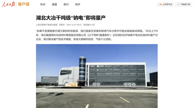 12月27日,《人民日报》客户端以《湖北大冶千吨级“钠电”即将量产》为题报道了我院青年博士李金懋在湖北融通高科先进材料集团股份有限公司(以下简称“融通高科”)挂职取得的成果。