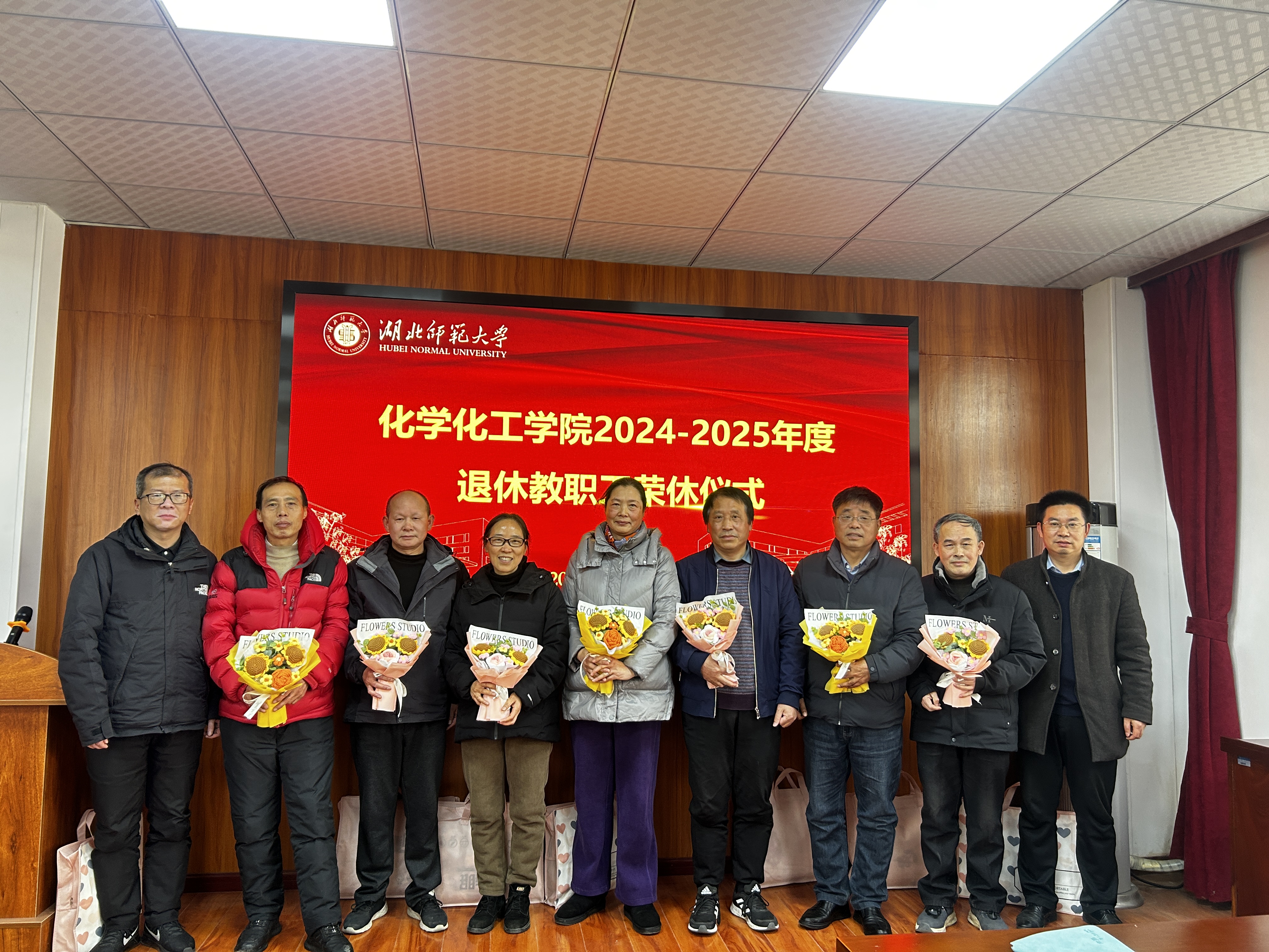 已退休和即将退休的教师依次发言,追忆了献身化院的从教历程,表达了对学院的美好祝愿和对同事的殷切祝福。一段短片简要展示了老教师们的基本情况和各教研室为退休教师送上的良好祝愿,伴随着《夕阳红》厚重深情的旋律将荣休仪式推向了高潮。青年教师代表为老教师送上捧花,表达了对老教师们的敬意。罗鸿飞、殷国栋为全体退休教师送上纪念品并合影留念。