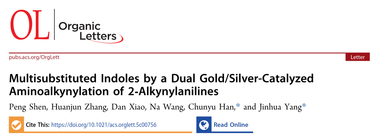 近日,国际知名期刊Organic Letters(《有机化学通讯》)在线发表了有机化学教研室韩春雨博士和杨进华副教授团队在金催化领域的最新研究成果。论文题目为“Multisubstituted Indoles by a Dual Gold/Silver-Catalyzed Aminoalkynylation of 2-Alkynylanilines”(金/银协同催化2-取代苯胺类化合物的氨基炔基化反应合成多取代吲哚)。2023级硕士研究生申鹏为论文第一作者,韩春雨博士为第一通讯作者,杨进华副教授为共同通讯作者,威廉williamhill为论文唯一通讯单位。Organic Letters是1999年由美国化学会(American Chemical Society)出版社发行的国际期刊,主要报道有机化学方面的最新研究进展,是中科院一区top期刊、自然指数(Nature Index)期刊,最新影响因子为4.9。