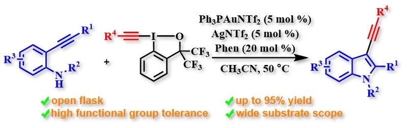 多取代吲哚是一类重要的结构单元,广泛存在于具有生物活性的天然产物、药物分子以及功能有机材料中,并在药物研发领域具有关键作用。然而,常规的合成方法存在明显局限性:需预先合成无环中间体或区域选择性控制等难题。该研究报道了一种高效的多取代吲哚合成新策略:在空气氛围下,通过双金/银催化体系的高价碘(III)试剂对2-取代苯胺类化合物的氨基炔基化反应。该方法的创新性体现在:(1)原位生成的炔基Au(III)物种可高效促进2-炔基苯胺的氨基炔基化过程,展现出优异的官能团兼容性和高收率;(2)机理研究证实炔基金(III)中间体在反应进程中起关键作用;(3)该方案具有克级放大潜力,且产物可进一步衍生化为多种功能化化合物。该研究为多取代吲哚的合成提供了新思路,其成果将吸引有机化学与材料科学领域研究者的广泛关注。