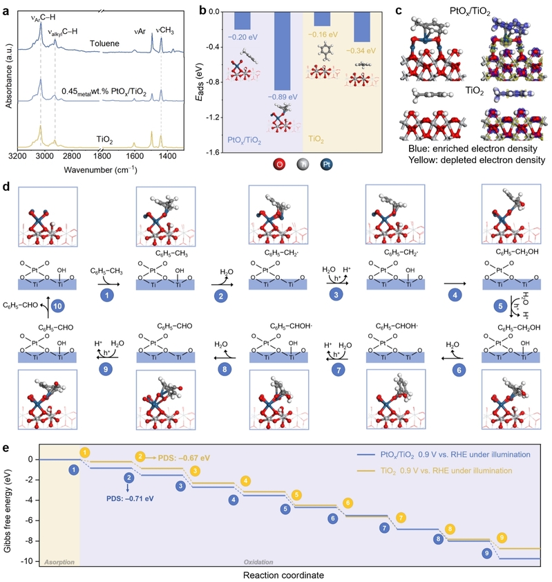 朱玉荃博士主要负责该论文中的理论计算工作。论文报道了在二氧化钛负载亚纳米PtOx团簇(PtOx/TiO2)光阳极上,甲苯光电催化氧化生成苯甲醛(BA),在水介质中,BA的产率为1.75 μmol cm-2 h-1,选择性为83.5%,比原始TiO2高4.4倍。该策略对甲苯衍生物的选择性氧化也同样起效。作为概念验证,还制造了一个具有S型流动通道的自供电光电催化串联装置,用于甲苯的氧化,在光照射下该装置的BA产量为~170 μmol。实验研究结合理论计算结果表明,PtOx/TiO2光阳极上的甲苯氧化遵循亲电羟基(OH*)介导途径,该途径可以抑制BA的过度氧化。此外,亚纳米PtOx团簇被证实可以促进甲苯的吸附和OH*的生成,从而实现了甲苯的高效氧化。该项工作有望拓宽在温和条件下水溶液中C(sp3)–H键的可持续活化途径。