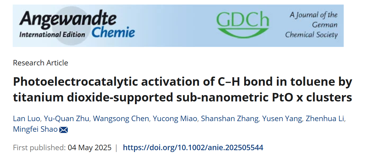 近日,国际期刊Angewandte Chemie International Edition(《德国应用化学》)在线刊发了物理化学教研室朱玉荃博士以“Photoelectrocatalytic activation of C–H bond in toluene by titanium dioxide-supported sub-nanometric PtOx clusters”(二氧化钛负载亚纳米PtOx团簇光电催化活化甲苯中C–H键)为题的学术论文。朱玉荃博士为论文共同第一作者。Angewandte Chemie International Edition由Wiley出版社1962年创办,是化学领域的权威期刊,SCI中科院大类一区TOP期刊、自然指数期刊,最新影响因子为16.6。