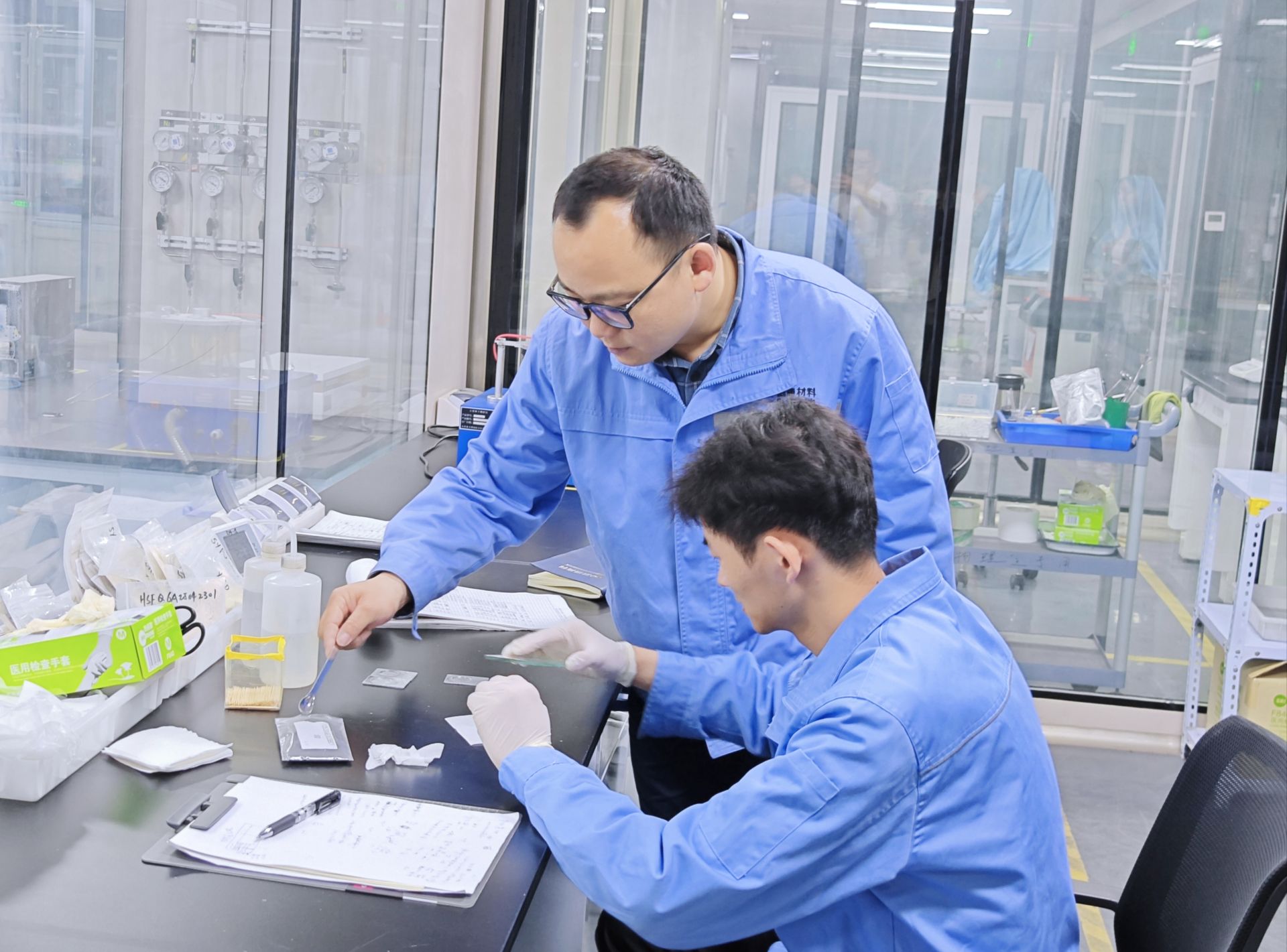 “制样时要控制粉末样品的粒度和样品表面的平整度,这两个变量会影响衍射峰的强度和位置……”在融通高科工程研究中心的XRD测试(X射线衍射测试)过程中,李金懋手把手指导助理工程师胡传斌相关注意事项。