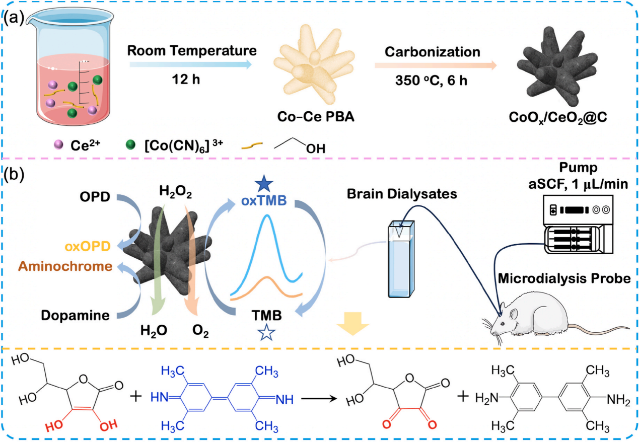 图1. (a) CoOx/CeO2@C的制备过程;(b)多功能仿生催化特性用于检测小鼠脑中AA示意图