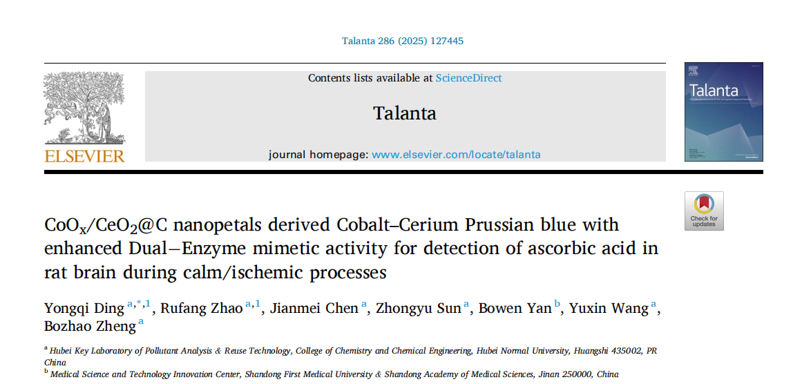 去年12月,国际知名期刊Talanta(《塔兰塔》)发表了我院分析化学教研室丁永奇博士团队在多功能纳米材料活体分析领域的最新研究成果。论文题为“CoOx/CeO2@C Nanopetals Derived Cobalt–Cerium Prussian Blue with Enhanced Dual−Enzyme Mimetic Activity for Detection of Ascorbic Acid in Rat Brain During Calm/Ischemic Processes”(基于钴-铈普鲁士蓝的衍生物CoOxCeO2@C纳米花瓣的双重模拟酶活性用于检测小鼠大脑中平静缺血过程中的抗坏血酸)。丁永奇博士和物理化学教研室赵茹芳博士为论文共同第一作者,丁永奇博士为论文通讯作者,威廉williamhill为论文第一单位。Talanta是Elsevier(爱思维尔)出版社旗下分析化学领域期刊、SCI中科院大类一区期刊(2023年12月升级版),最新影响因子为5.6。