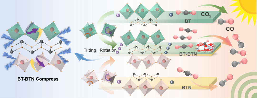 共生层状结构铁电体,由于其内部固有的强自发极化电场,能够持续有效地驱动载流子的分离与迁移,使其成为极具潜力的压电光催化材料。该工作通过简单一步水热法制备了具有强自发极化的共生铁电薄层纳米片Bi7Ti4NbO21 (BT-BTN),并将其应用于压电光催化CO2还原领域。密度泛函理论(DFT)计算结果表明,层间晶格失配引起的八面体倾斜和旋转角度变化是极化增强的主要原因,并且在外界应力作用下会进一步增强。BT-BTN中氧八面体沿a轴和a-b平面内具有较大的倾斜角和旋转角,这种变化破坏了晶体对称性,导致面外铁电自旋极化和极化场强度的增强。当BT-BTN受到应力作用时,其内部八面体的变化会进一步增强极化电场的强度,从而产生更强的压电极化电场,驱动载流子的分离与迁移,实现高效的压电光催化还原性能。该研究为理解高性能共生铁电压电光催化剂的催化机制提供了全新的视角和方向,同时也为开发新型高效能源转换与环境治理技术开辟了新的路径。