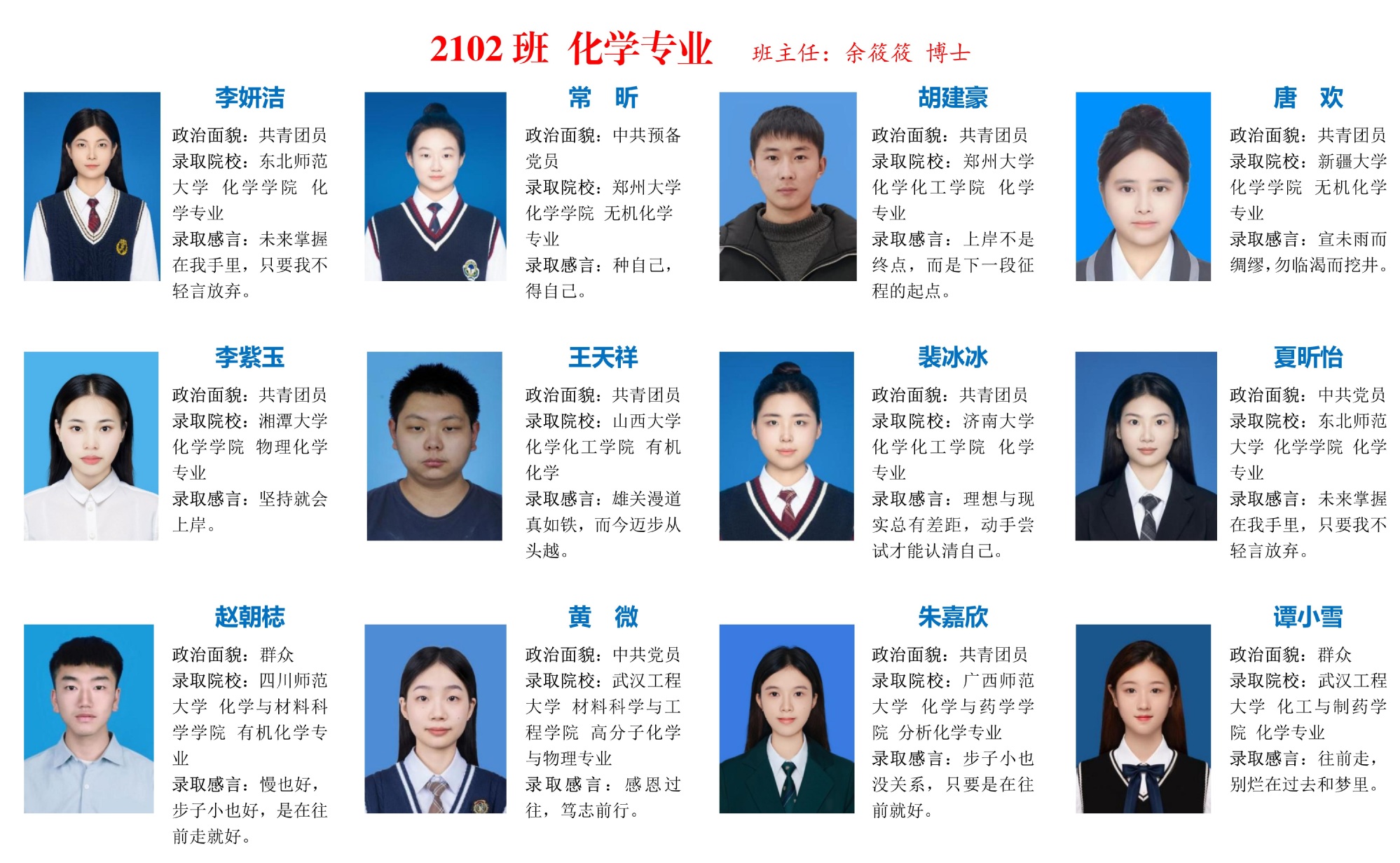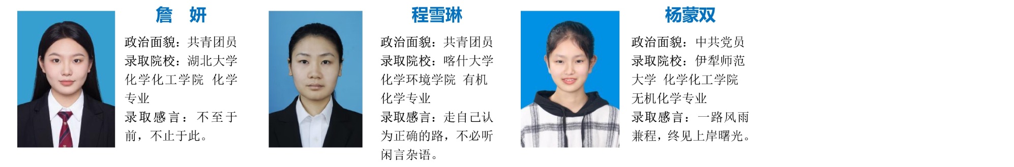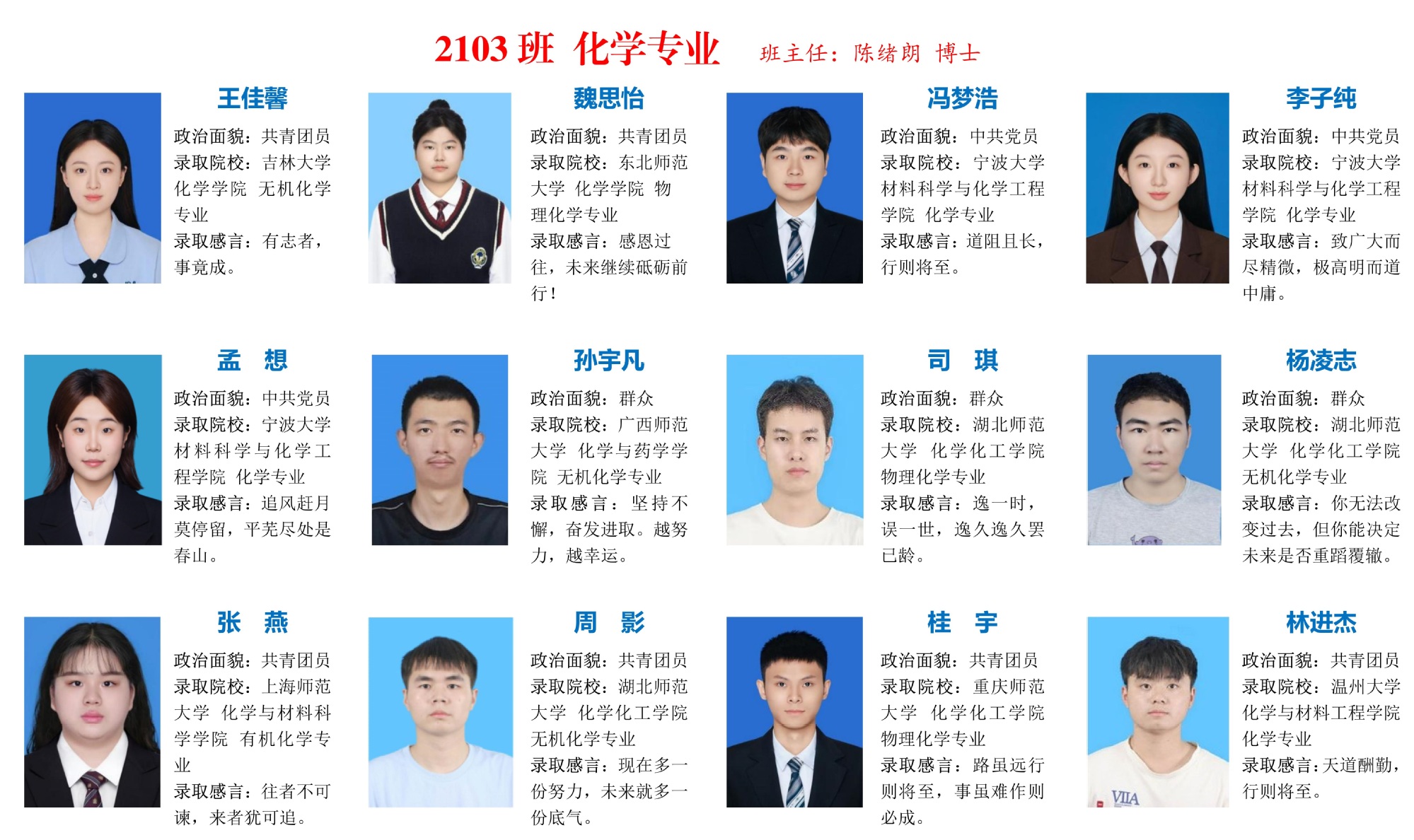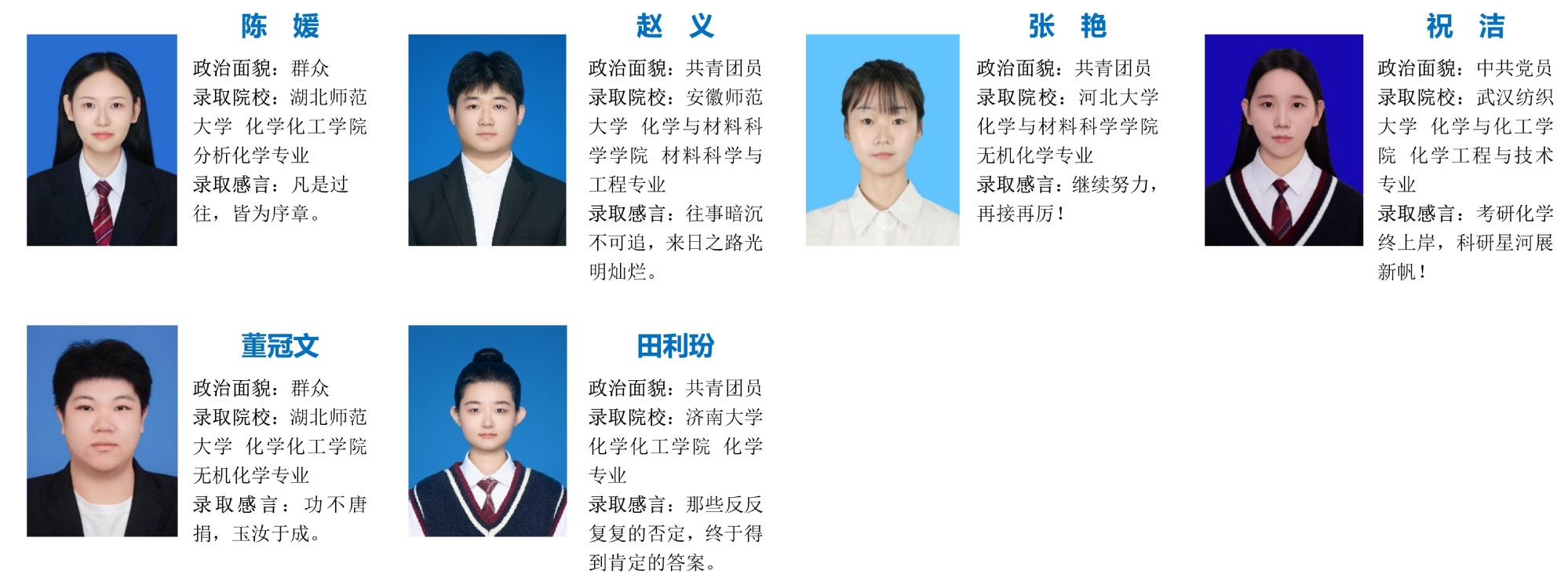 编者按:光不问赶路人,时光不负有心人!在这个充满希望与收获的季节,学院2025届考研学子以坚韧不拔的毅力和勇往直前的决心,在考研战场上披荆斩棘,斩获佳绩!我院2025届本科生被国内各高校、科研院所共录取108人,占毕业生总数(优师计划除外)的40.60%,连续两年考研录取率超过40%。本期推送化学专业考研光荣榜,他们挑灯夜战、攻坚克难,将无数个日夜的汗水凝结成通往梦想的阶梯。
