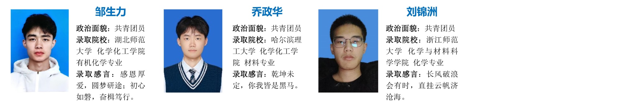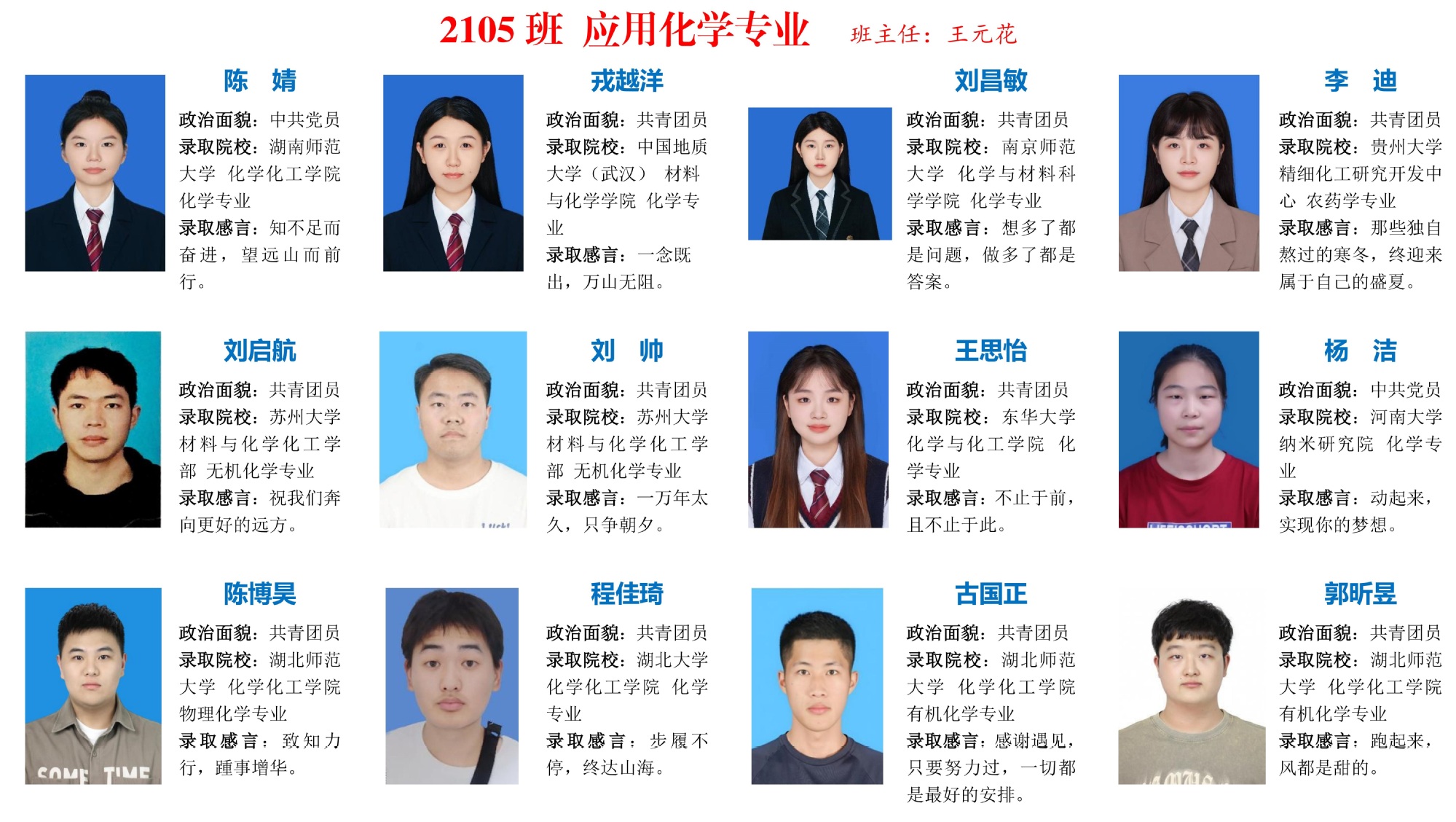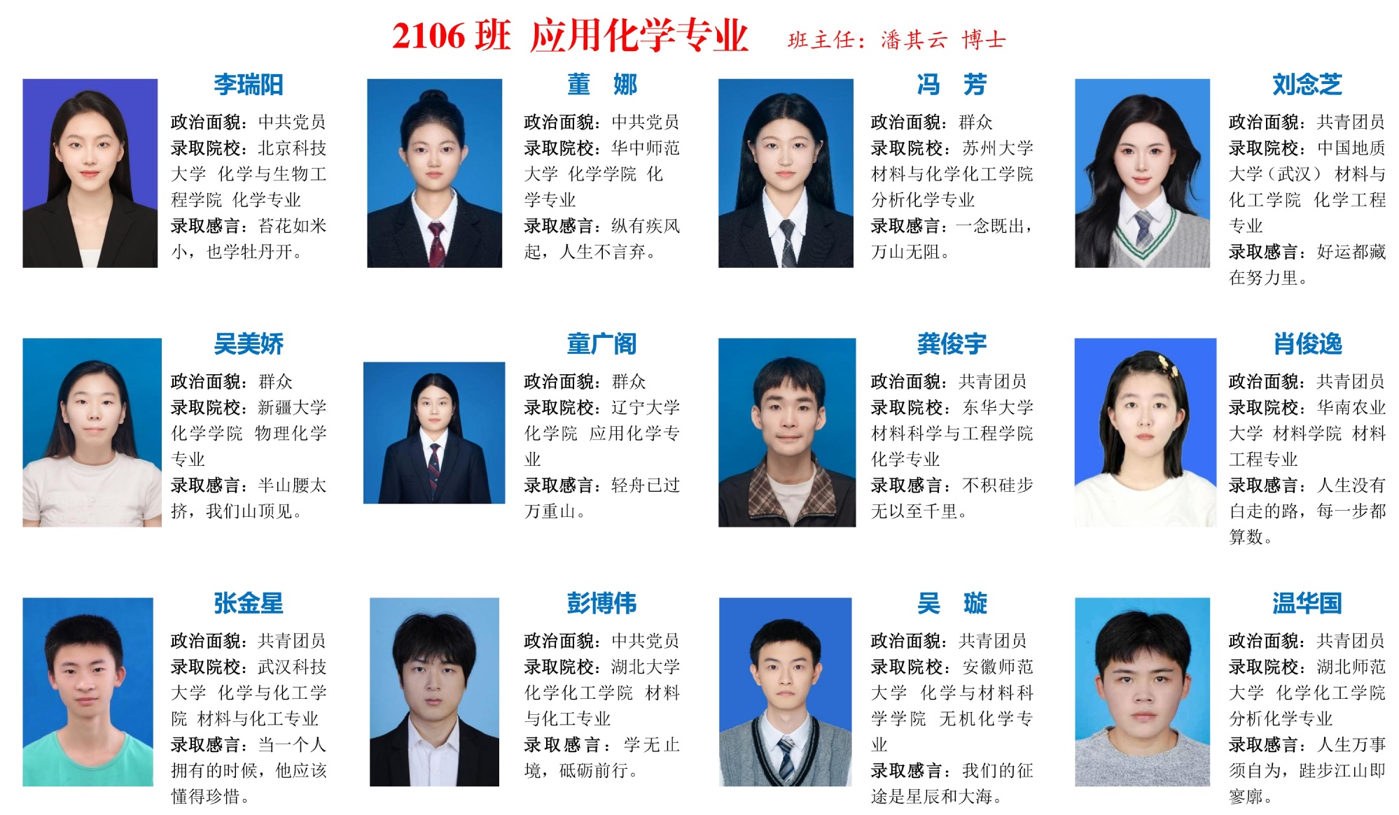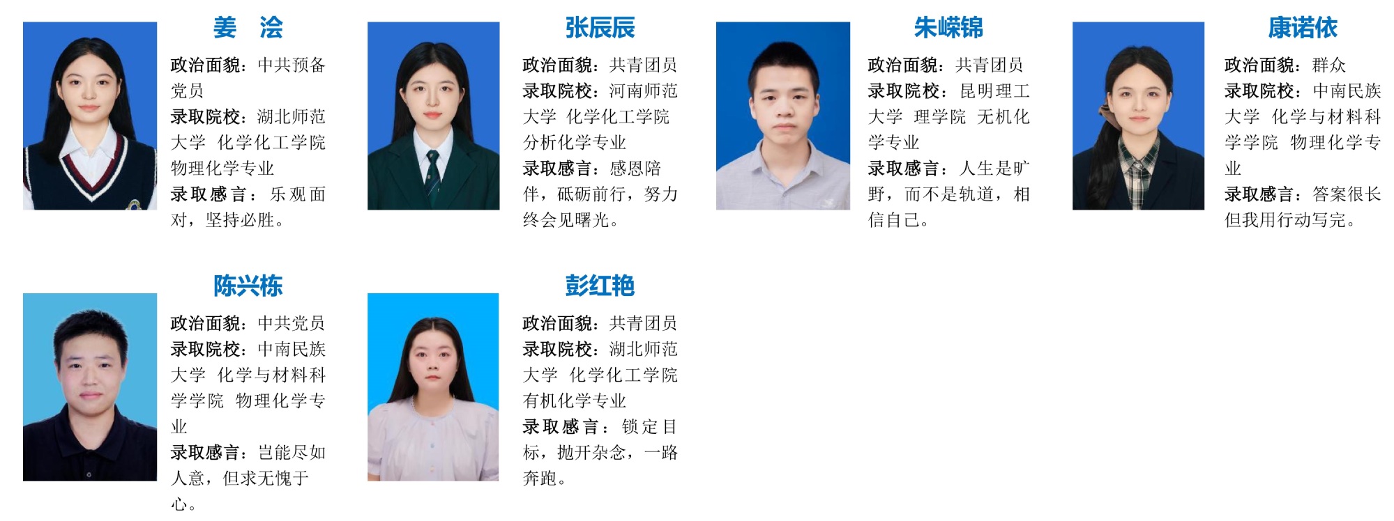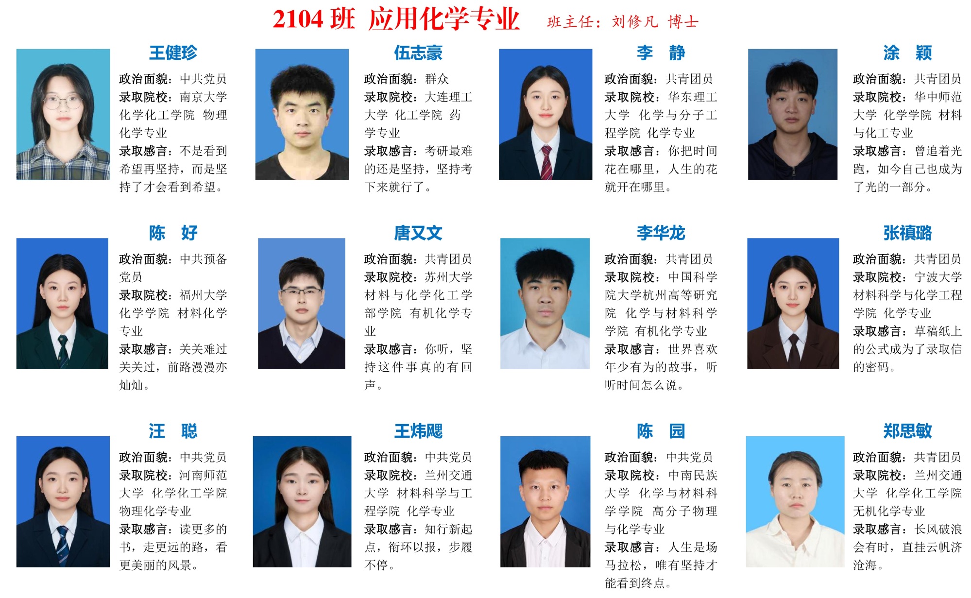 编者按:时光不负追梦人,奋斗终绽芳华。这一趟有山重水复,也终见柳暗花明;虽漫长而艰辛,但终有回报之日。我院2025届本科生被国内各高校、科研院所共录取108人,占毕业生总数(优师计划除外)的40.60%,连续两年考研录取率超过40%。本期推送应用化学专业考研光荣榜,从考研人到研究生,这是一场华丽的蜕变!坚持与努力成就了今天的闪耀。愿在新的征程中,大家可以初心如磐,继续书写属于自己的辉煌篇章。