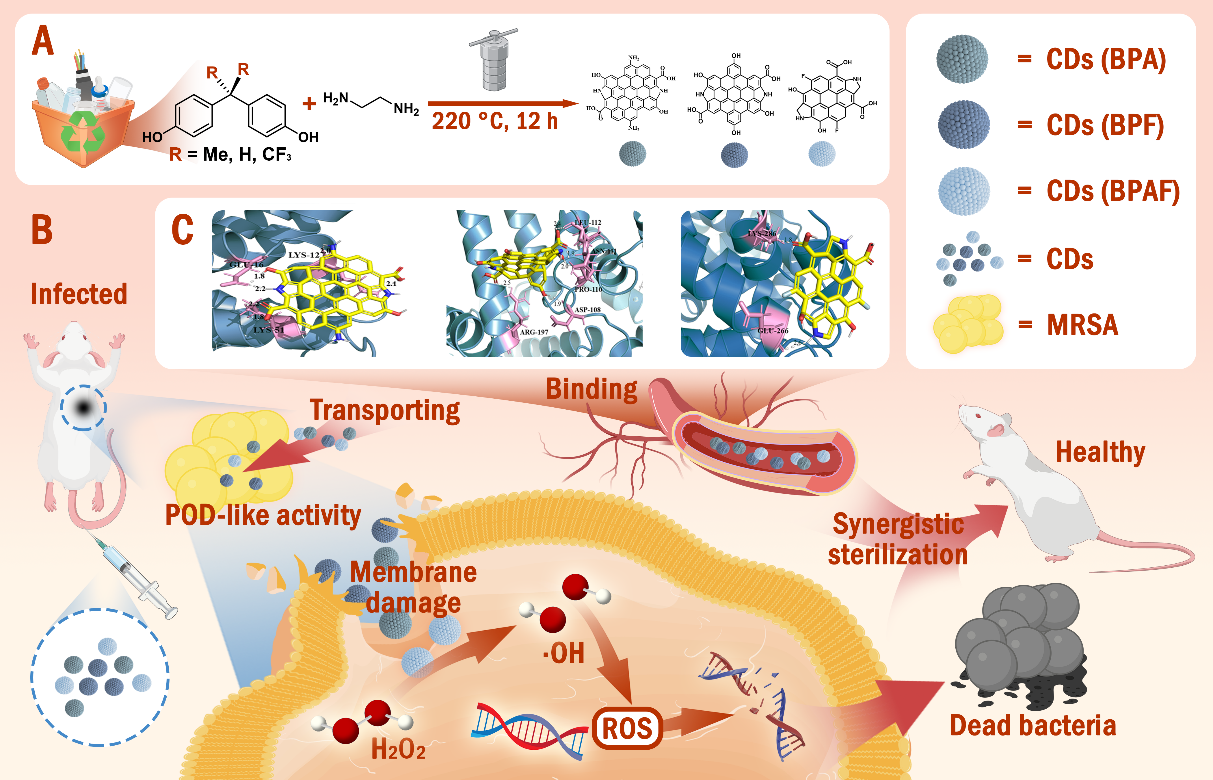 该研究针对双酚类环境激素的污染,通过一锅法合成了具有抗菌活性的碳点,从而实现对双酚类环境激素的回收处理,产生的碳点(CDs)还能有效地治疗细菌感染。双酚环境激素是工业消费品(如塑料和环氧树脂)中常见的污染物,因其类似雌激素的结构、长期的生态风险和高化学反应性而成为内分泌干扰物。该研究探讨了用双酚环境激素合成的新型CDs,以解决双酚污染问题。双酚化合物的加入增强了CDs的光学特性和生物活性。此外,改性后的CDs具有低毒性、良好的生物相容性和穿透细菌生物膜的能力。值得注意的是,掺氟的CDs(BPAF)表现出更强的过氧化物酶样活性,能促进H2O2转化为活性氧(ROS),从而增强CDs的抗菌功效。分子机制研究显示,CDs与人血清白蛋白(HSA)之间存在明显的相互作用,这凸显了CDs在纳米医学中的应用潜力。该项研究推动了绿色化学和环境修复技术的发展,有助于开发对保护生态系统和公众健康至关重要的安全有效的抗菌材料。