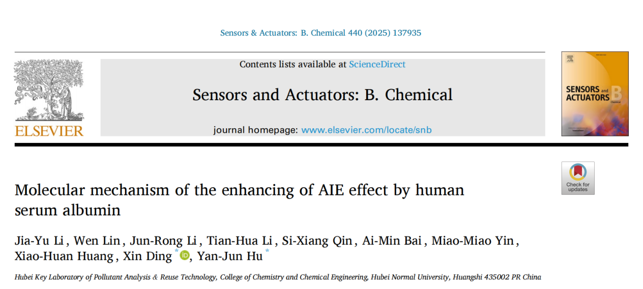 5月,Sensors and Actuators B: Chemical(《传感器和执行器B:化学》)在线发表该团队研究成果,论文题为“Molecular mechanism of the enhancing of AIE effect by human serum albumin”(《人血清白蛋白增敏AIE分子荧光的作用机制》)。我院2022级硕士研究生李佳雨为论文第一作者,胡艳军教授和丁鑫博士为通讯作者,威廉williamhill为论文唯一通讯单位。Sensors and Actuators B: Chemical是Elsevier出版社旗下的化学领域期刊,SCI中科院大类一区TOP期刊,最新影响因子为8.0。