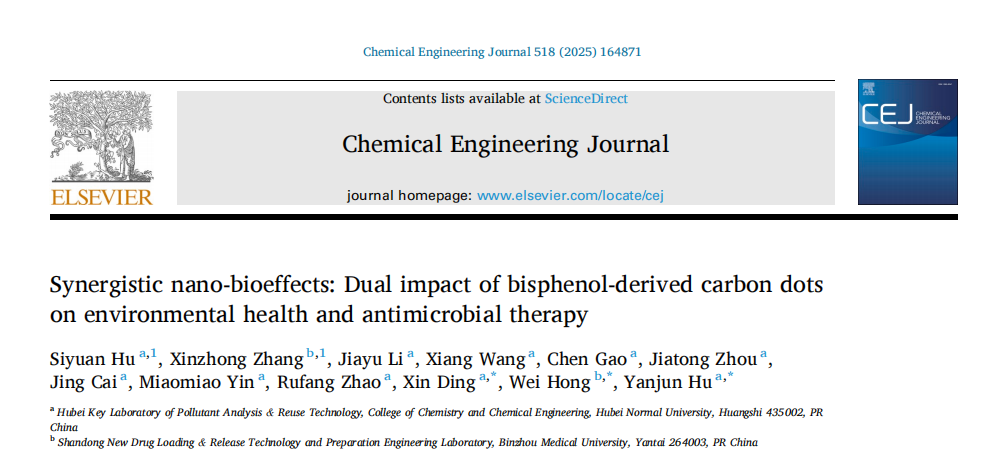 6月,Chemical Engineering Journal(《化学工程杂志》)在线发表该团队又一研究成果,论文题为“Synergistic Nano-Bioeffects: Dual Impact of Bisphenol-Derived Carbon Dots on Environmental Health and Antimicrobial Therapy”(《协同纳米生物效应:双酚衍生碳点对环境健康和抗菌疗法的双重影响》)。我院2022级硕士研究生胡思源与滨州医学院硕士研究生张馨中为论文共同第一作者,我院无机化学教研室丁鑫博士、滨州医学院宏伟教授以及胡艳军教授为论文共同通讯作者,威廉williamhill为第一通讯单位。Chemical Engineering Journal是Elsevier出版社旗下的材料科学领域期刊,SCI中科院大类一区TOP期刊,最新影响因子为13.3。