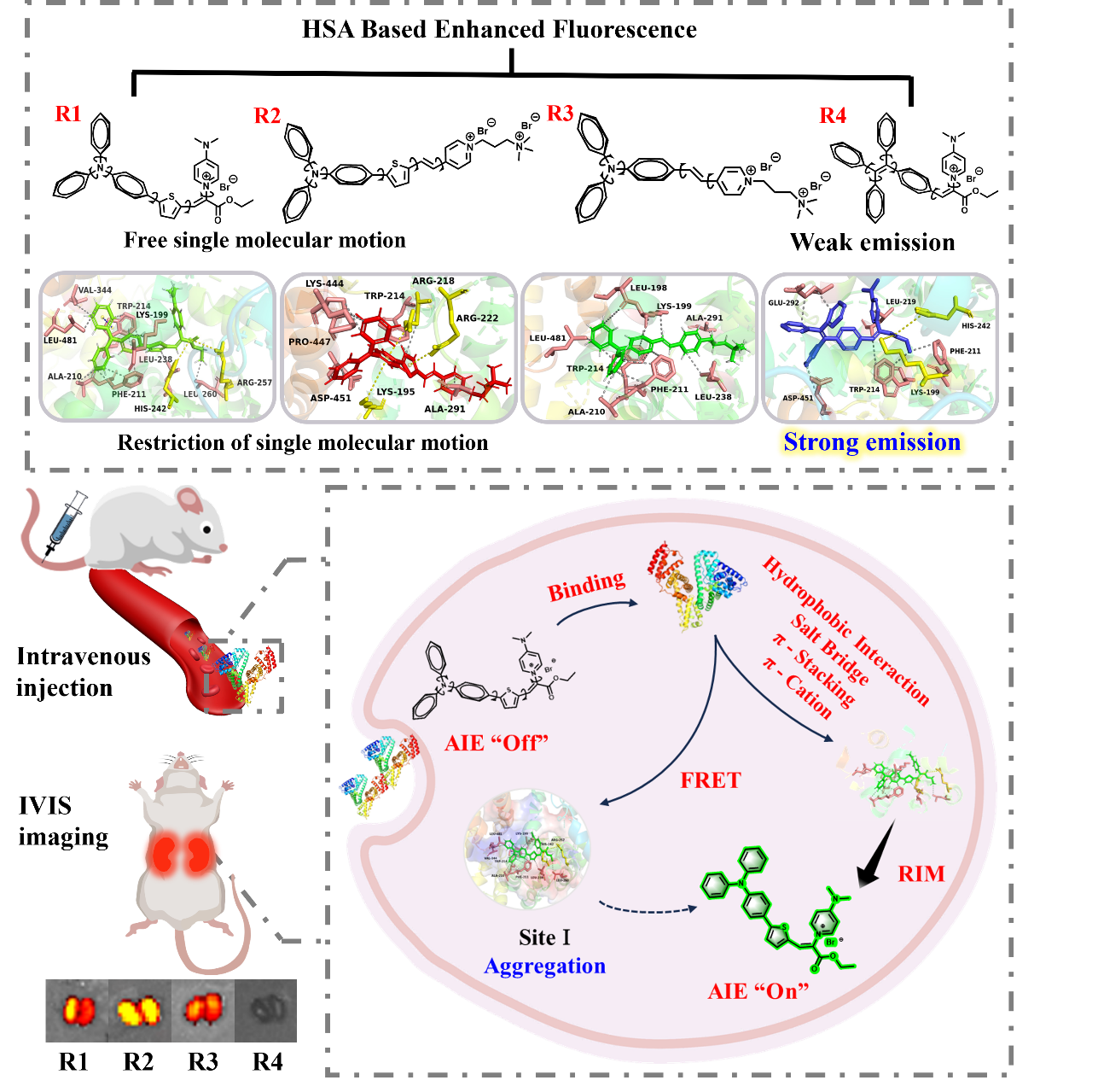 该研究针对生物系统中聚集诱导发光(AIE)分子的有效聚集难题,选取了四种具有相同电子受体但不同电子供体和烷基侧链的AIE分子。通过电化学分析、荧光光谱和分子对接技术,系统揭示了AIE分子与人血清白蛋白(HSA)之间的相互作用,阐明了HSA在激活AIE荧光中的关键角色及其对AIE效应的影响。研究显示,这些AIE分子在Tris-HCl缓冲溶液中由于螺旋桨式柔性结构而不稳定且发光微弱,但与HSA结合后,荧光强度显著提升40至309倍。此外,AIE分子与HSA的结合产物展现出优异的生物相容性,并能实现细胞和肾脏的高分辨率成像。这些发现不仅增进了对AIE材料体内发光机制的认识,也为AIE材料在生物成像技术中的应用提供了理论基础。