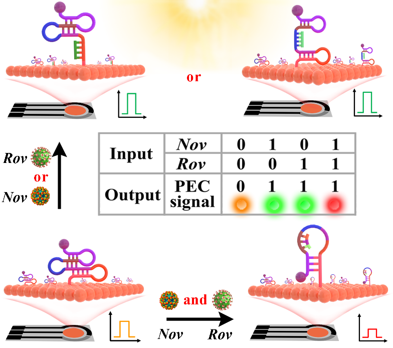 单链DNA三重异构辅助的DNA逻辑门赋能PEC多元检测水环境病毒示意图