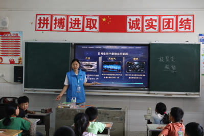 陈锦添、李军和谭琳焯3位同学走进排市镇中心完全小学,分别为不同年级小学生进行宣讲。陈锦添向学生讲述了“北山万年级工程”,这是我国高放废物深地质处置的关键实践,需将核废物安全埋藏于地下数百米稳定地质体中,实现长期隔离。她以北山戈壁上的胡杨作喻,讲述一代代北山人在恶劣环境中克服路途遥远、物资匮乏等困难,默默坚守的奋斗故事,这些故事让孩子们深受触动。谭琳焯先让学生猜想“什么是人造太阳”,并通过近年来气温逐渐升高的现象,引出“能源”话题,先给学生们介绍了能源是什么,随后介绍了生活中常见的能源有哪些,通过以上内容引出核能的概念,并开始为学生介绍核聚变和太阳的联系。李军以“两弹一星”的辉煌历史为切入点,结合日常生活中的能源使用场景,逐步引出核能在当代的应用价值,重点阐述了核电站作为清洁能源的广阔发展前景。随后,他借助示意图和动画演示,用“原子世界的能量释放”这样形象的比喻,科普了核能产生的微观原理,以及压水堆、沸水堆等常见核电站的通用工作机制。