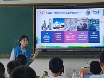 张琬婷、姚雨晴和任锐3位同学走进排市镇明德小学,为一至六年级小学生进行宣讲。张琬婷以视频形式展示了核能的基本概念,让同学们对这一神秘又强大的能量有了初步的感性认识,随后将话题引入公共安全领域,详细讲述安检技术的由来与发展。她从最初简单的金属探测说起,逐步讲到如今利用核技术实现的复杂安检系统,使对核技术守护世界安全有了全新且深刻的认识。任锐以居里夫人的名言“世界上没有什么可怕的事,只有需要被我们了解的事,我们多了解一份,那么担心害怕便会少一分”破题,从什么是核辐射、无处不在的核辐射、核电站保护、历史上的核事故以及核技术应用等五个方面进行宣讲,通过让学生们充当起小小建筑师,让学生们从一名建筑师的身份来思考核电站的建造要考虑哪些方面,然后再给出核电站的建造需要注意的事项。姚雨晴则详细介绍了“华龙一号”作为我国核电技术走向世界的“国家名片”,如何通过“能动与非能动相结合”的安全设计、177组燃料组件堆芯等十大创新成果,打破国外技术垄断的突破历程,解释了这些创新在提升发电效率和安全冗余上的原理,让大家直观感受科技突破的硬核力量。