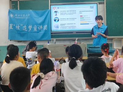 7月12日,宣讲团成员王宇欣、金萧宇走进浠水县华桂中学,为六升七、七升八年级学生带来一堂有趣生动的宣讲。金萧宇以“什么是核能?”为切入点,通过原子弹、氢弹等学生熟悉的例子,深入浅出地讲解了核能的基本原理及其在国防与民生中的重要作用。他从中国核工业的起步、发展里程碑、重大科技成果等方面展开,在一个个故事中带领同学们穿越“三个30年”,回顾了我国核工业从无到有、从弱到强的辉煌历程,鼓励大家树立科技报国的远大理想。王宇欣则从“核辐射是什么”“核辐射从哪儿来”“辐射的测量与防护”“常见的放射性元素与核技术的应用”四个方面进行了讲解。她用“能量粒子的旅行”比喻阐释核辐射本质,结合示意图说明原理;列举土壤中的铀、空气中的氡等天然辐射源,以及医疗检查等人工辐射场景;介绍距离防护、屏蔽防护等方法;还通过核医学治疗、食品辐照保鲜等案例展现核技术应用。