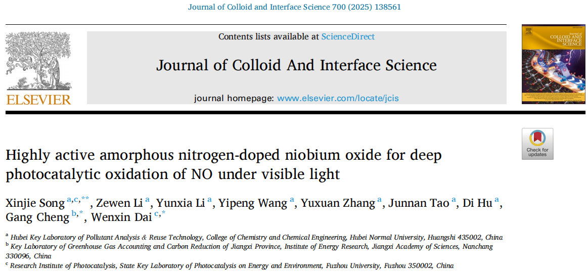 近日,国际知名期刊Journal of Colloid And Interface Science(《胶体与界面科学》)在线发表了物理化学教研室宋昕杰博士团队在光催化去除氮氧化物领域的最新研究成果。论文题为“Highly active amorphous nitrogen-doped niobium oxide for deep photocatalytic oxidation of NO under visible light”(高活性无定形氮掺杂五氧化二铌在可见光下深度光催化氧化NO)。宋昕杰博士为论文第一作者和通讯作者,江西省科学院程刚副研究员和福州大学戴文新研究员为论文共同通讯作者,威廉williamhill为论文第一单位。Journal of Colloid And Interface Science是ELSEVIER(爱思唯尔)出版社旗下工程技术领域期刊、SCI中科院大类一区期刊,最新影响因子为9.7。