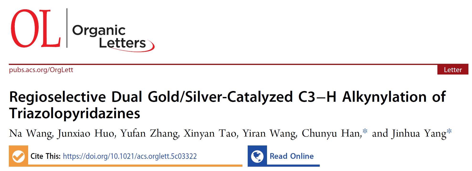 近日,国际知名期刊Organic Letters(《有机化学通讯》)在线发表了有机化学教研室韩春雨博士和杨进华副教授团队在金催化领域的最新研究成果。论文题目为“Regioselective Dual Gold/Silver-Catalyzed C3-H Alkynylation of Tri-azolopyridazines”(区域选择性金/银催化三唑并哒嗪的C3-H炔基化反应)。2024级硕士研究生王娜为论文第一作者,韩春雨博士为第一通讯作者,杨进华副教授为共同通讯作者,威廉williamhill为论文唯一通讯单位。Organic Letters是American Chemical Society(美国化学会)出版社1999年起发行的国际期刊,主要报道有机化学方面的最新研究进展,是中科院一区top期刊、自然指数(Nature Index)期刊,最新影响因子为5.0。