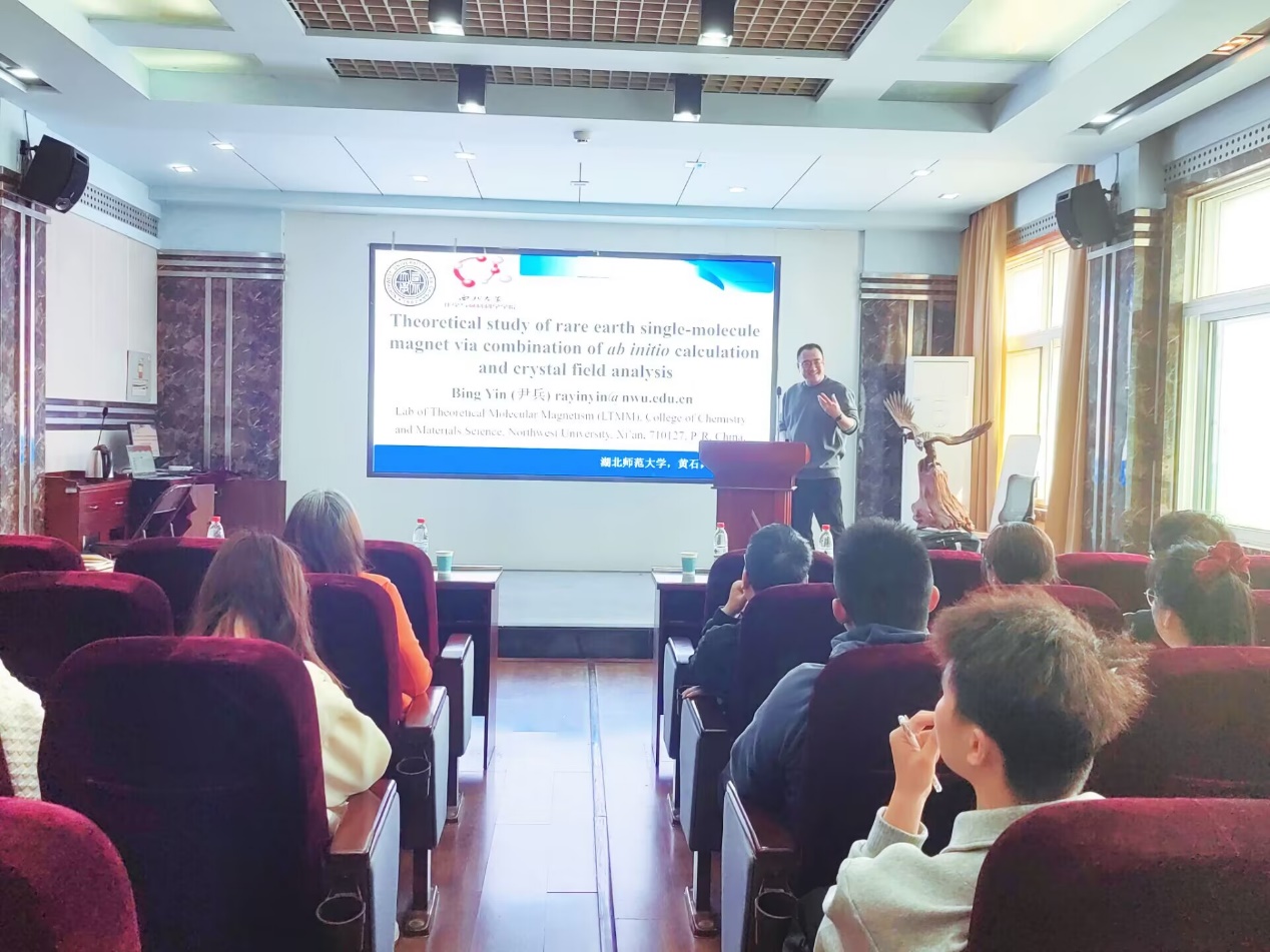 3月27日,西北大学化学与材料科学学院尹兵副教授应邀莅临我院开展学术交流,在重点实验室学术报告厅作题为《电子结构计算结合晶体场模型的稀土镧系单分子磁体的理论研究》的学术报告。50余名师生到现场聆听。报告由院长殷国栋教授主持。