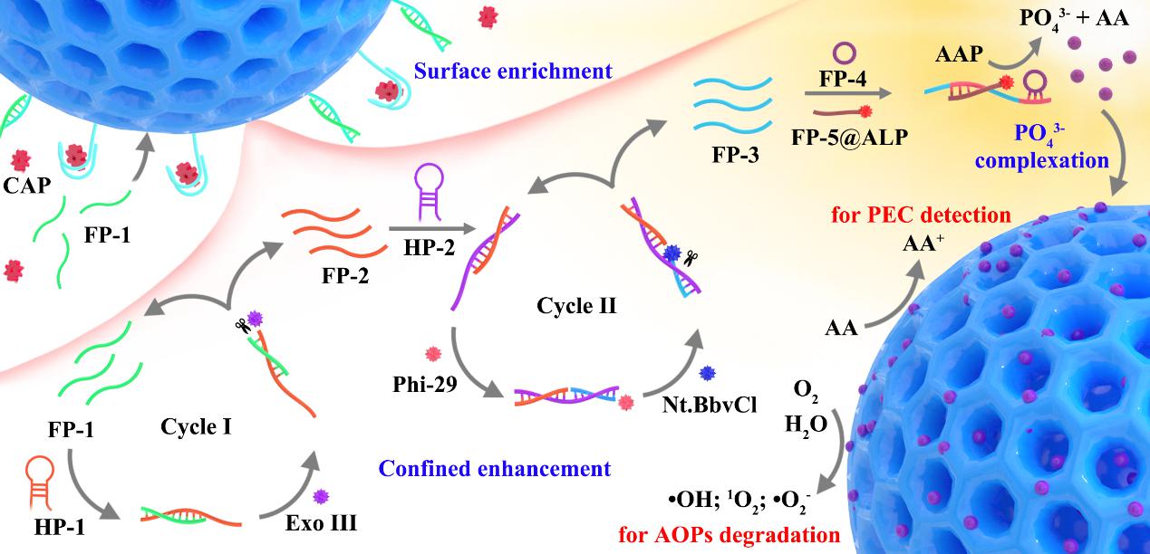针对抗生素污染对水生生态系统及人类健康带来的潜在威胁,该研究聚焦环境分析领域中污染物“识别检测”与“催化降解”一体化发展的前沿需求,围绕传统检测与处理过程相互分离以及整体效率偏低等问题,创新性设计了基于 Zr-MOFs 分级结构的双功能界面,构建了集“PEC生物识别”与“AOPs氧化降解”于一体的协同反应体系。该体系通过表面修饰适配体实现对目标抗生素氯霉素的特异性识别与富集,并依托 MOFs 内部空腔介导的限域增强效应,提升反应体系检测信号因子与催化氧化活性分子的输出效率。实验结果表明,所构建体系不仅可实现对氯霉素的超灵敏光电化学检测,还能够借助原位生成的活性氧物种对富集在Zr-MOFs基质表面富集的氯霉素进行高效降解消除,有望为水环境污染物的监测与治理提供新思路。