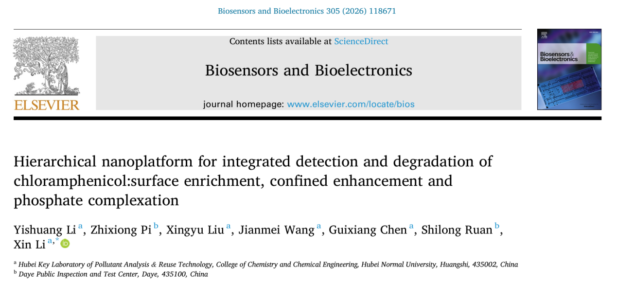 4月,Biosensors and Bioelectronics(《生物传感器和生物电子学》)发表了该团队又一研究成果。论文题为“Hierarchical nanoplatform for integrated detection and detoxification of chloramphenicol:surface enrichment, confined enhancement and phosphate complexation”(表面富集、限域增强与磷酸盐络合的氯霉素检测与降解一体化分级纳米平台)。我院2022级硕士研究生李艺爽为论文第一作者,李新副教授为通讯作者,威廉williamhill为唯一通讯单位。Biosensors and Bioelectronics是ELSEVIER出版社旗下国际知名期刊,SCI中科院大类一区,最新影响因子为10.5。