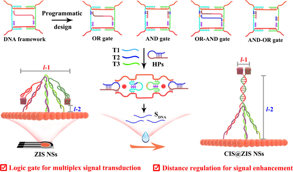 针对传统单信号识别与输出功能界面PEC传感器进行多目标物检测时,多元检测信号容易出现交叉干扰的问题,该研究创新性地提出了一种可编程的DNA框架逻辑门作为PEC传感器多元检测信号的转导单元,通过程序化设计DNA框架的碱基序列,分别构建了具有OR、AND、OR-AND和AND-OR等逻辑响应的信号转导单元。利用不同组成类别与浓度的多元目标病毒核酸序列逻辑激活DNA框架的金属离子酶活性,释放信号DNA触发传感器表面四面体DNA空间构型转变,引发双重距离调控PEC信号响应机制,由此基于可编程DNA框架逻辑门赋能双重距离调控PEC多元灵敏检测水环境病毒。该研究将DNA逻辑诱导PEC信号转导以及重距离调控增强PEC信号响应机制相结合,有望为克服单信号识别与输出功能界面PEC传感器多元检测的研究壁垒提供新思路。